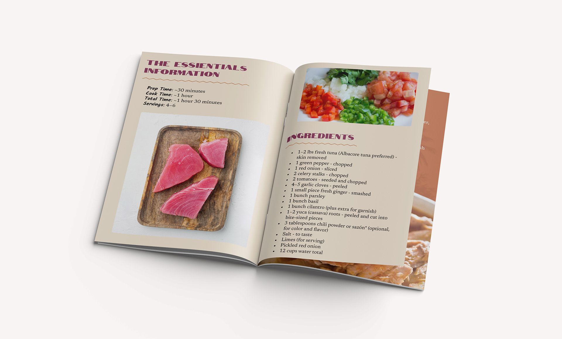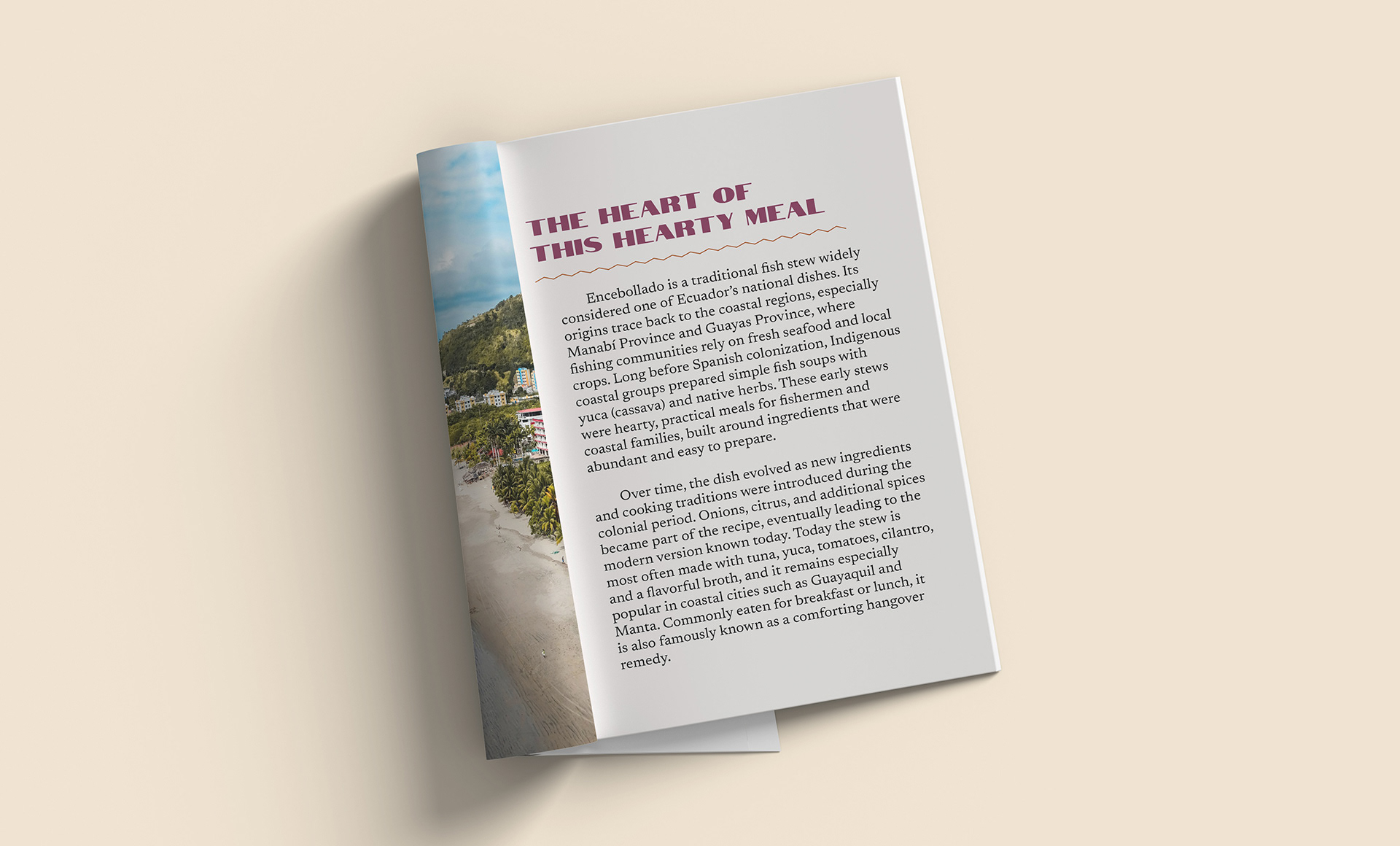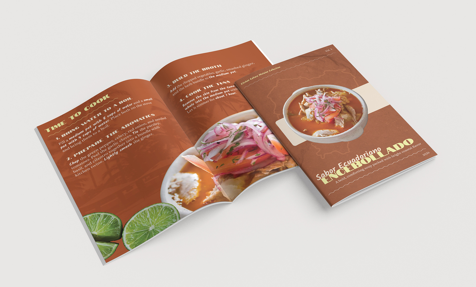 The colors of the minizine were inspired by the warm tones seen within ecuadorian encebollado. Tones of off whites from the cooked yuca and tuna work cohesively with the rustic orange seen from the hearty broth of the stew. Additional hints of yellow and purple seen from other elements of the dish were used to tie the palette together. Other design elements such images of the Ecuadorian coast line and the jagged lines reflecting an indigenous tone bring in unique details that reflect the dish’s conception.